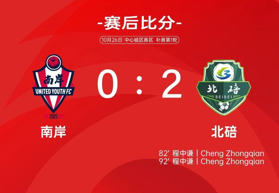 下半场比赛,北碚机会仍然不少,但仍然屡次错失良机。第82分钟,北碚获得右侧角球机会,替补上场的39号球员程中谦门前机警捅射破门。补时阶段,程中谦利用反击再入一球,在上演梅开二度的同时,也将比分锁定为2:0。