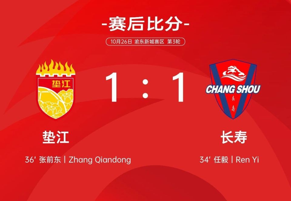 34分钟,长寿55号球员任毅反越位成功,左脚小角度破门,帮助客队率先进球。仅仅2分钟过后,长寿解围没能踢远,垫江30号球员张前东禁区内右脚凌空抽射破门,将比分扳成1:1平。下半场比赛,双方未能继续进球,最终1:1握手言和。